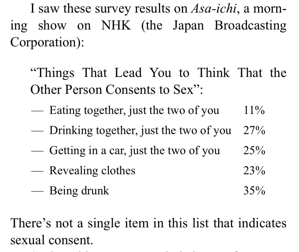 Ito’s book launched the #MeToo movement in Japan, but this is so much more than what is become in “outing” abusers and giving fuel to “cancel culture”. There is clearly a need for a more common definition and better reporting along with a complete overhaul of the system that abuses and shames it’s victims. There is a need for more education and specialism on the topic. We cannot expect someone who is not trained in handling trauma victims to do that work. This of course is after the fact, but the ideal would be to teach our children better to make sure this doesn’t happen. Teach them about consent. Which Ito found is questionable in a survey she found: